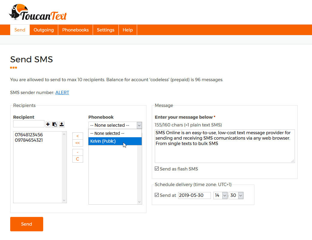ToucanText’s SMS Online has been designed as a simple-to-use online messaging portal, giving users the ability to send individual messages to single recipients or bulk send to multiple contacts in a single broadcast. Some of the features include the ability to set up and store contacts in the form of address books, schedule messages to be sent out at a later date and even send flash SMS messages.